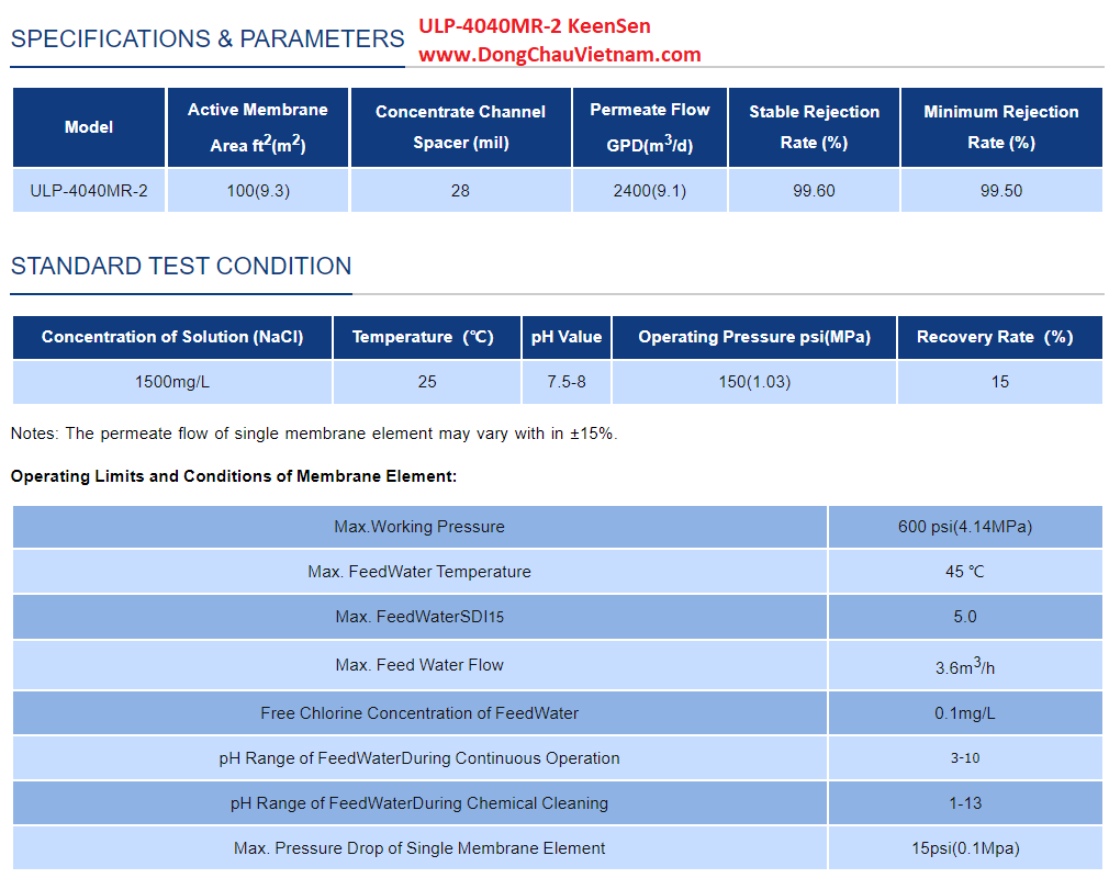 Diện tích màng là 100 ft2 ( 9.3 m2), lưu lượng 2400 gallon (9.1 m3)/ ngày đêm